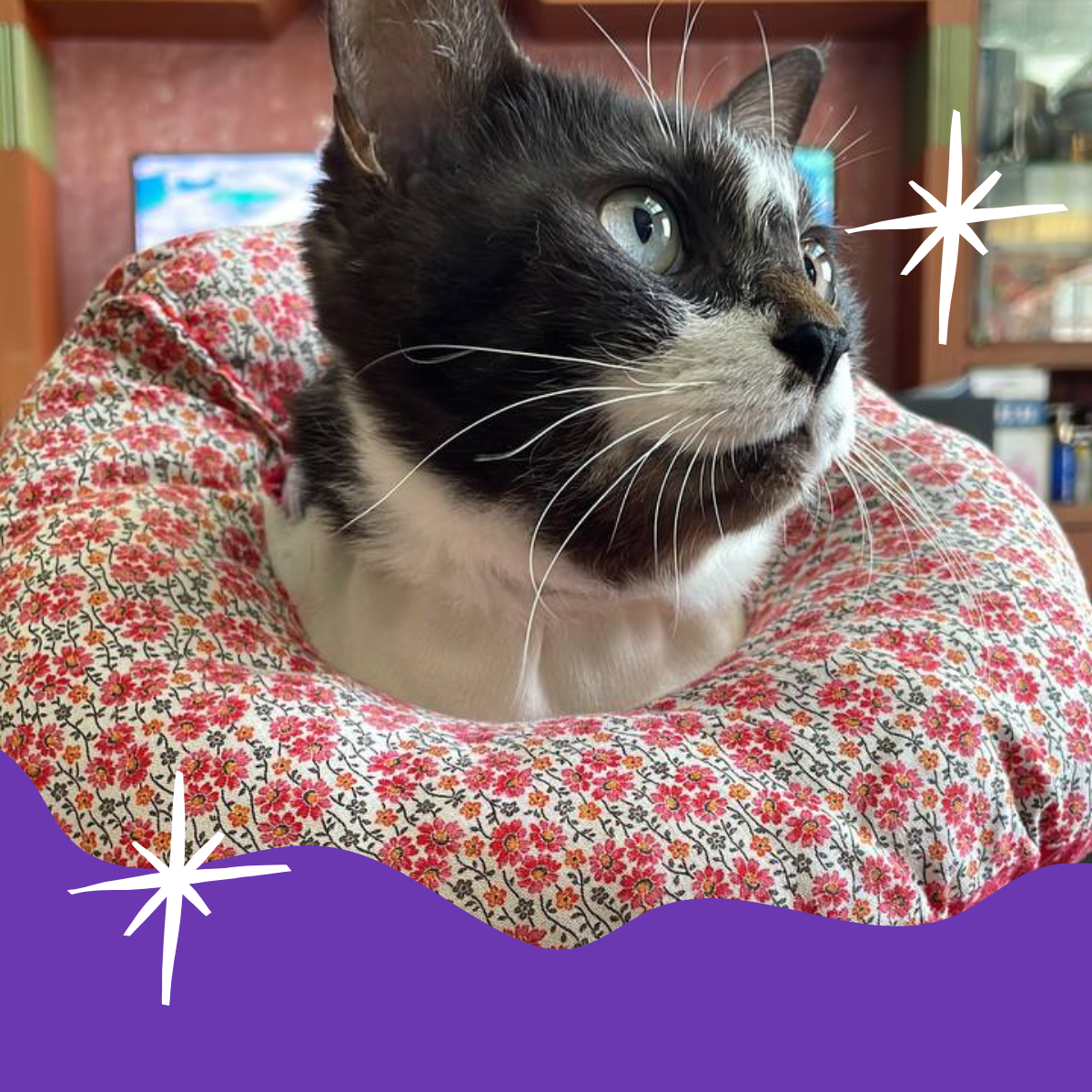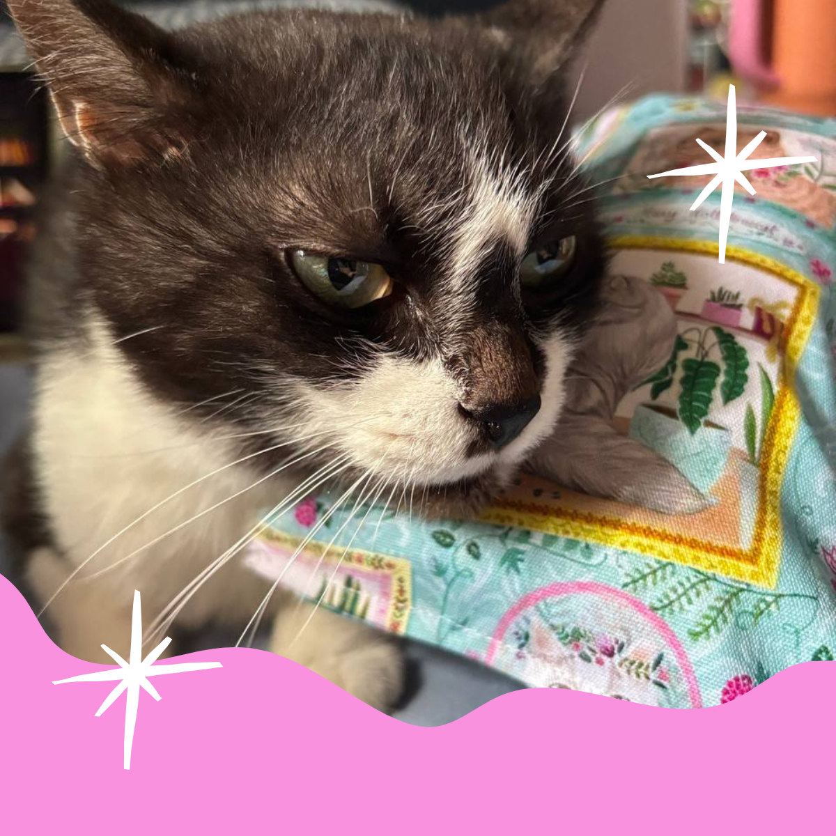 Korokke-chan was adopted in Japan and has been inspiring mischief (and handmade magic) ever since. When she developed skin issues in 2021, the vet asked that she wear a cone, and it pained my heart to see her in the traditional, hard e-collars. I decided to learn to sew so I could make soft, comfy collars just for her.